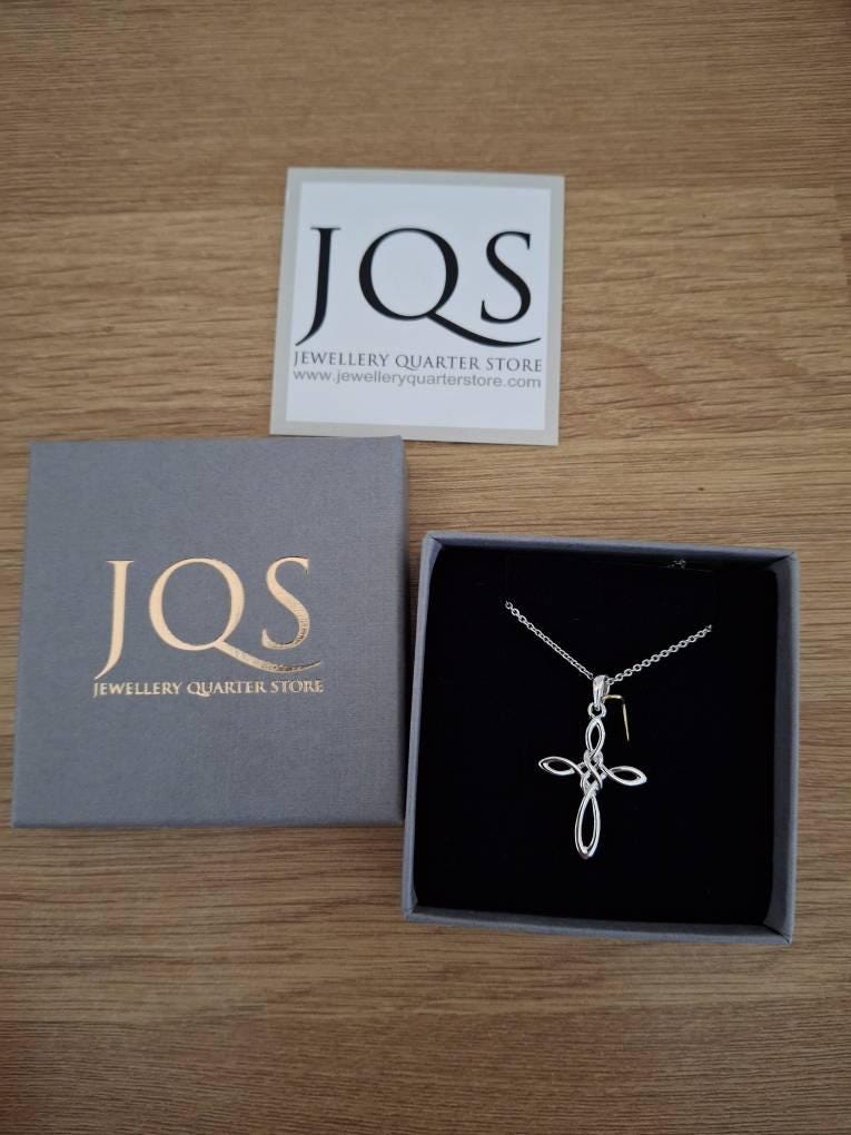 Beautiful rhodium plated sterling silver Celtic knot cross necklace.