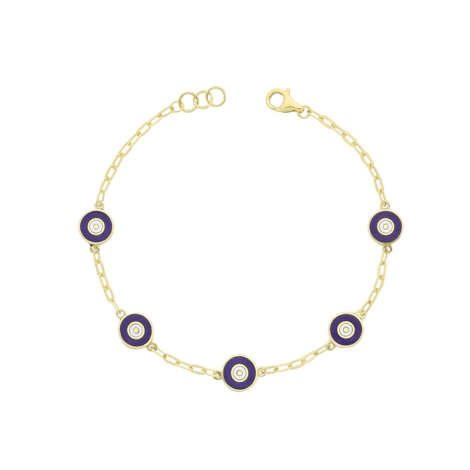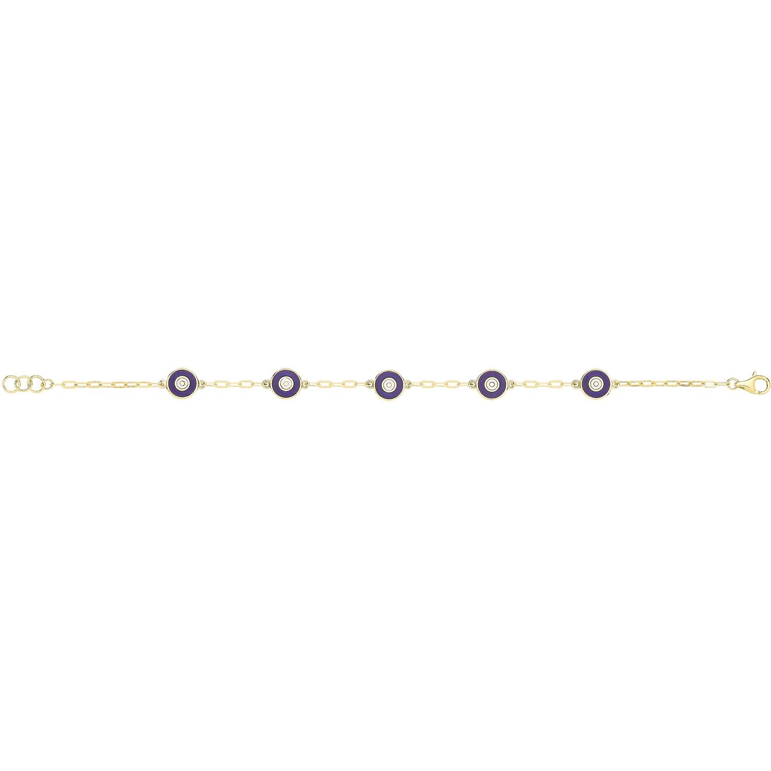 A gorgeous evil eye bracelet set with 5 blue and white enamelled evil eye round disc charms crafted in solid 9ct yellow gold.