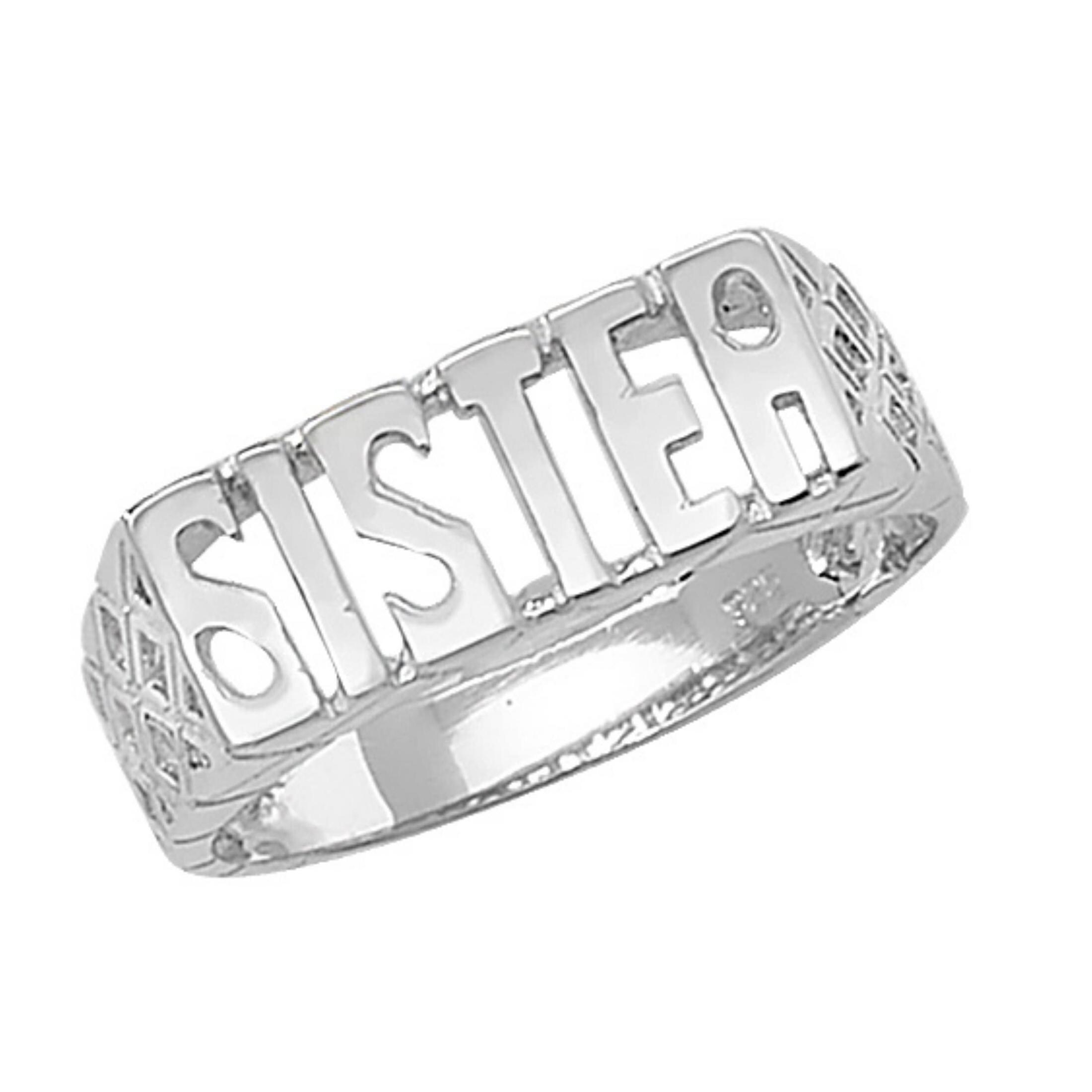 Lovely 'SISTER' ring is crafted in 925 sterling silver with cut out basket weave shoulders.