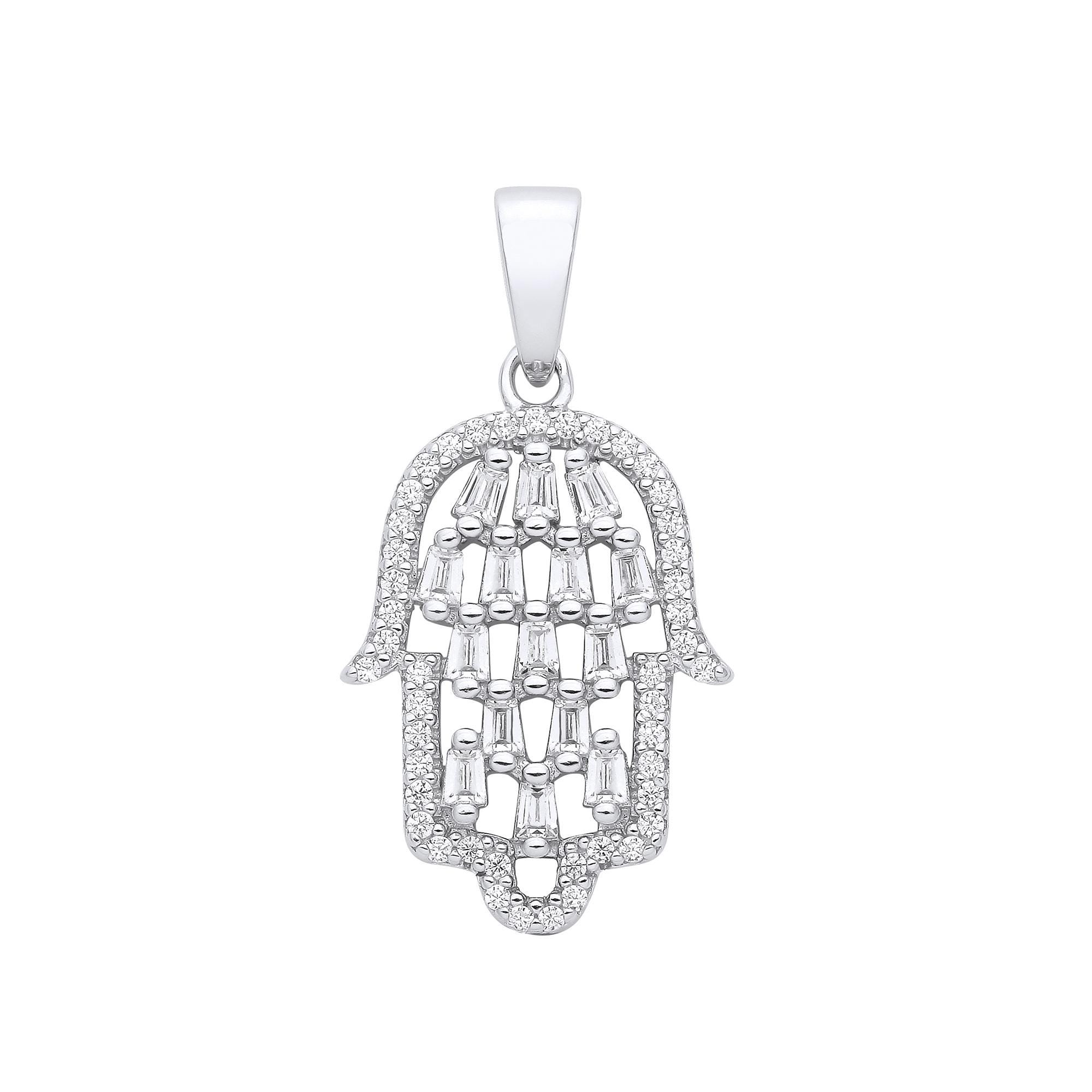 A gorgeous contemporary Hamsa Hand charm pendant set with baguette and round cz stones crafted in 925 sterling silver.