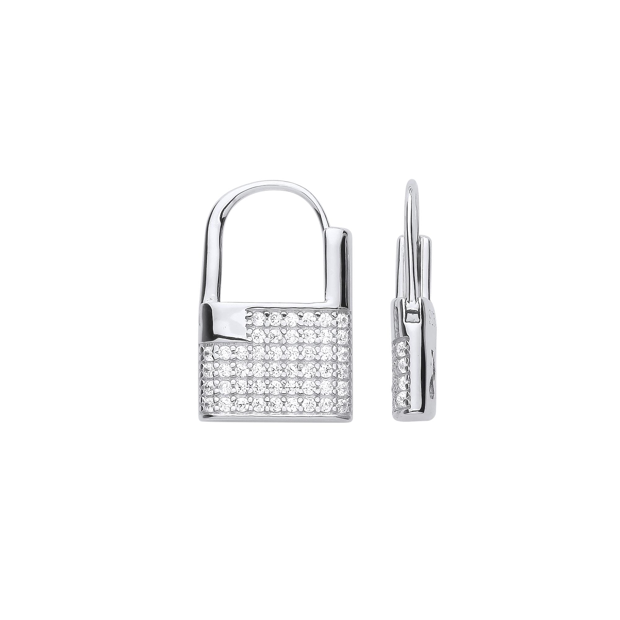 A modern pair of sterling silver padlock design pave set Cz hinged huggies hoop earrings.