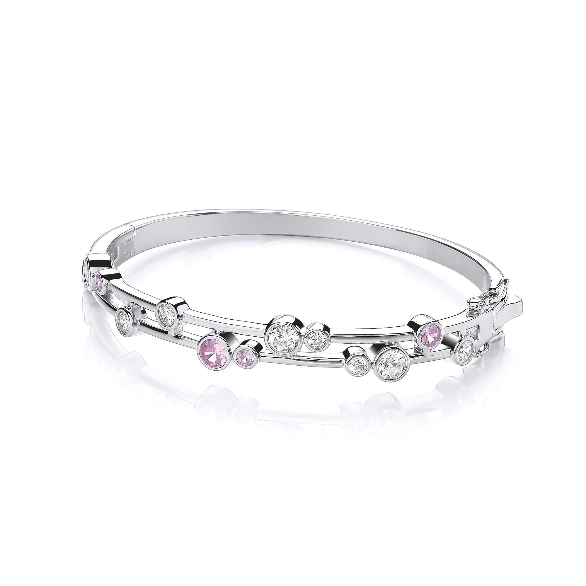 Make an impression with this stunning brilliant pink and clear cz bezel set hinged bangle.