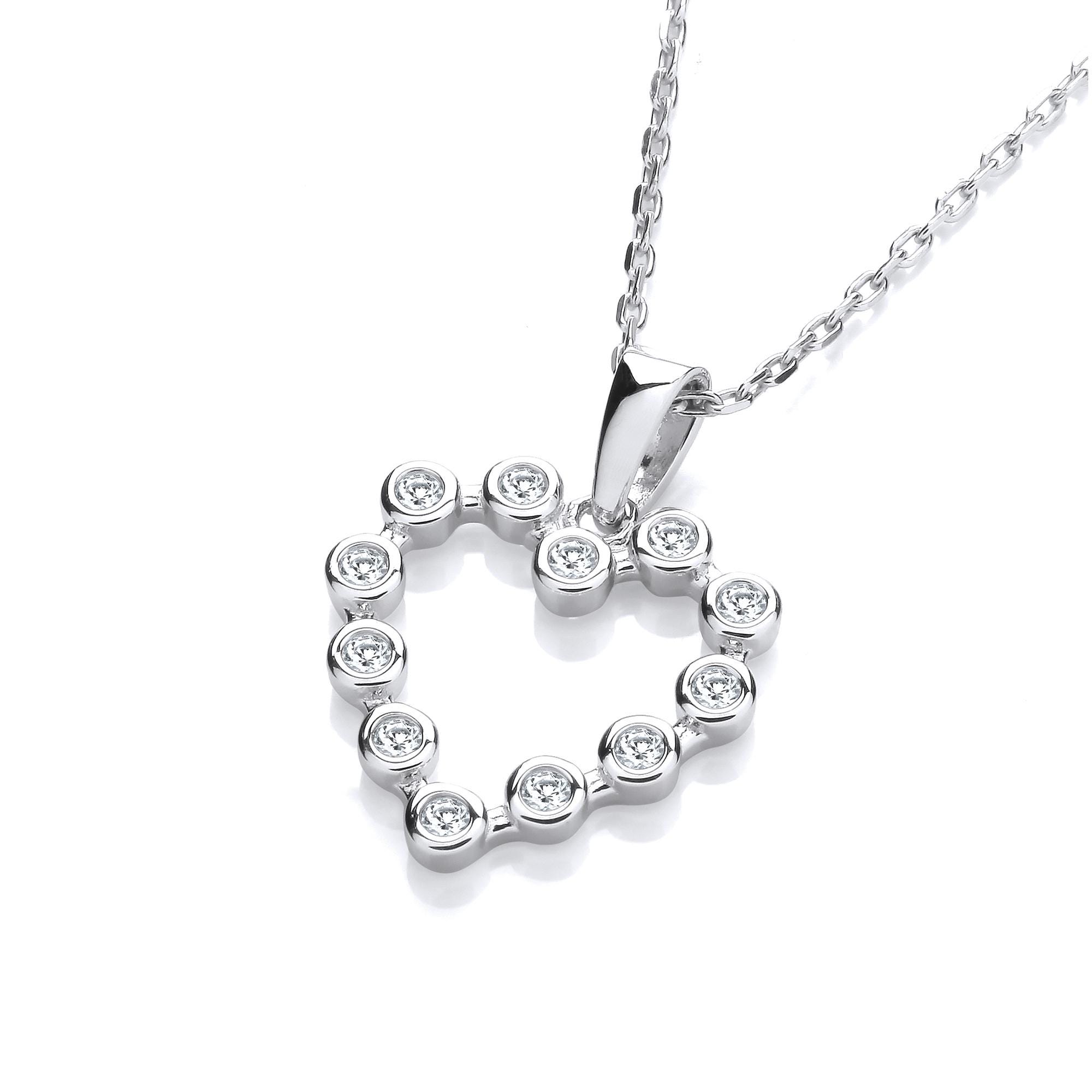 Beautiful bezel set cz heart charm necklace crafted in rhodium plated 925 sterling silver.