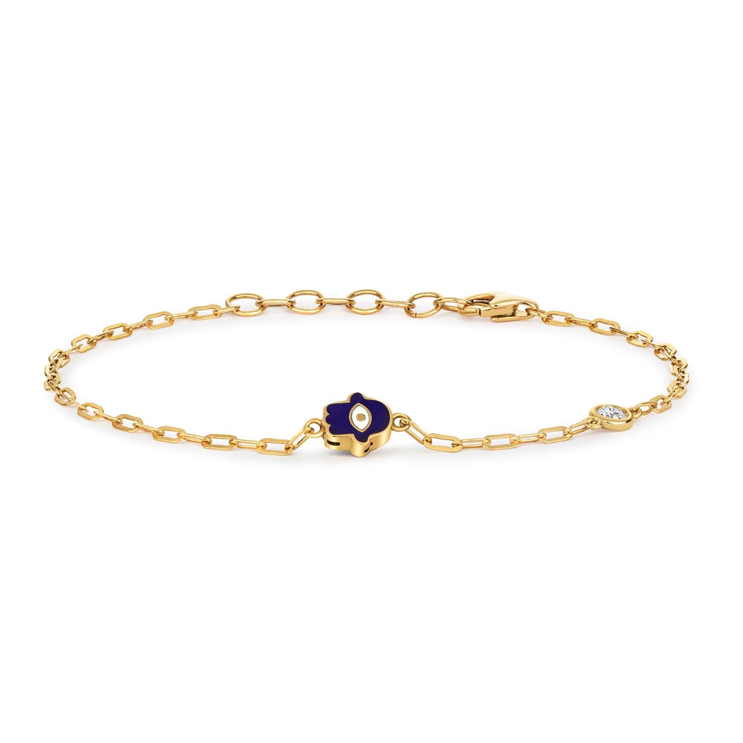 A gorgeous evil eye Hamsa hand charm bracelet with blue enamel detail and a single bezel set lab grown diamond crafted in 9ct yellow gold.