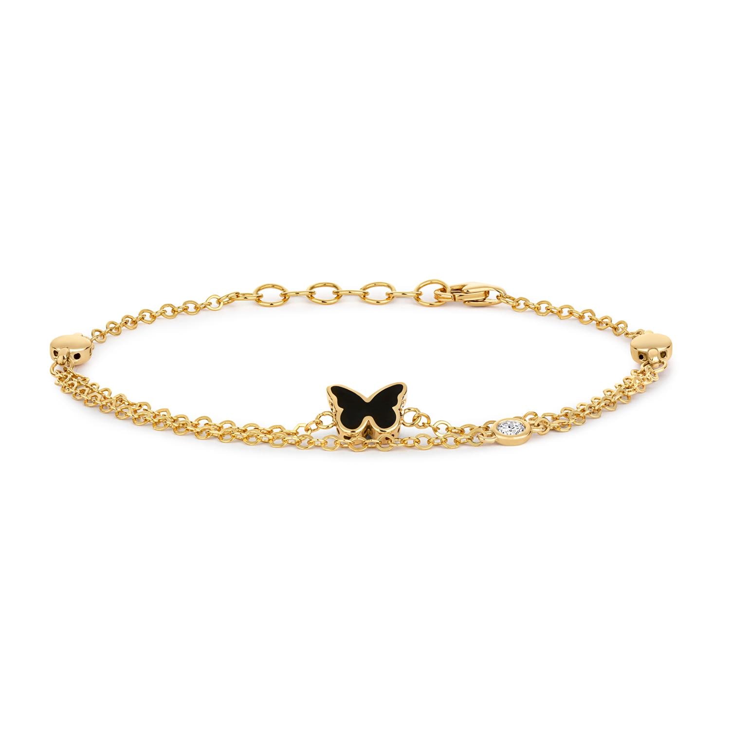 A gorgeous butterfly charm bracelet with black enamel detail and a single bezel set lab grown diamond crafted in 9ct yellow gold.