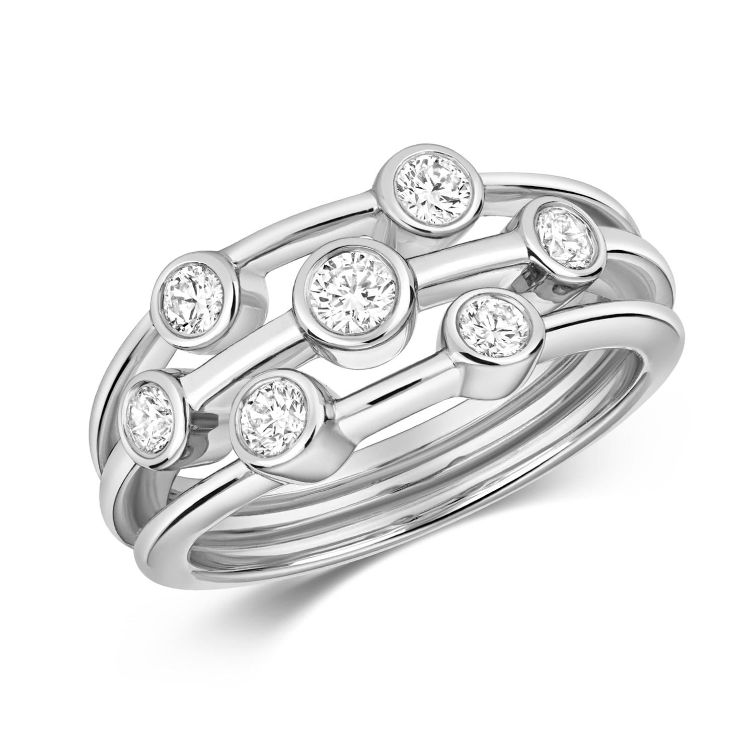 This gorgeous sterling silver three band ring is rub-over set with seven round cut lab grown diamond stones.