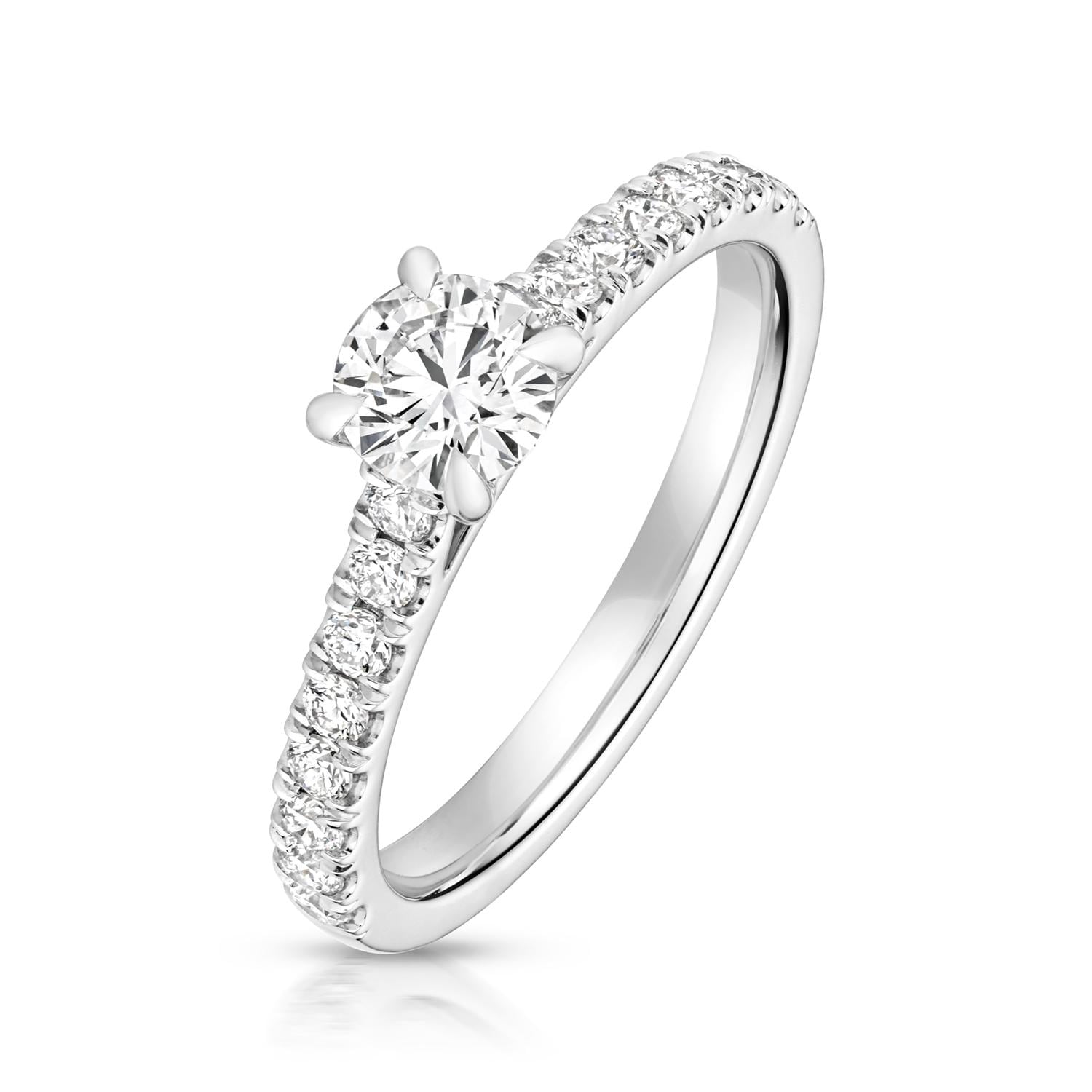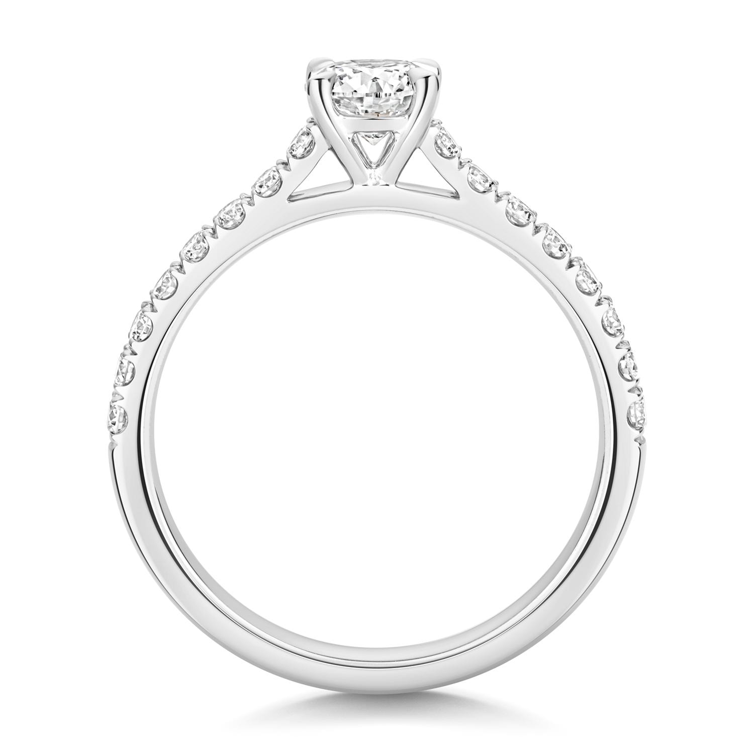 This gorgeous sterling silver engagement ring is set with a solitaire round cut half carat lab grown diamond with pave set diamond shoulders.