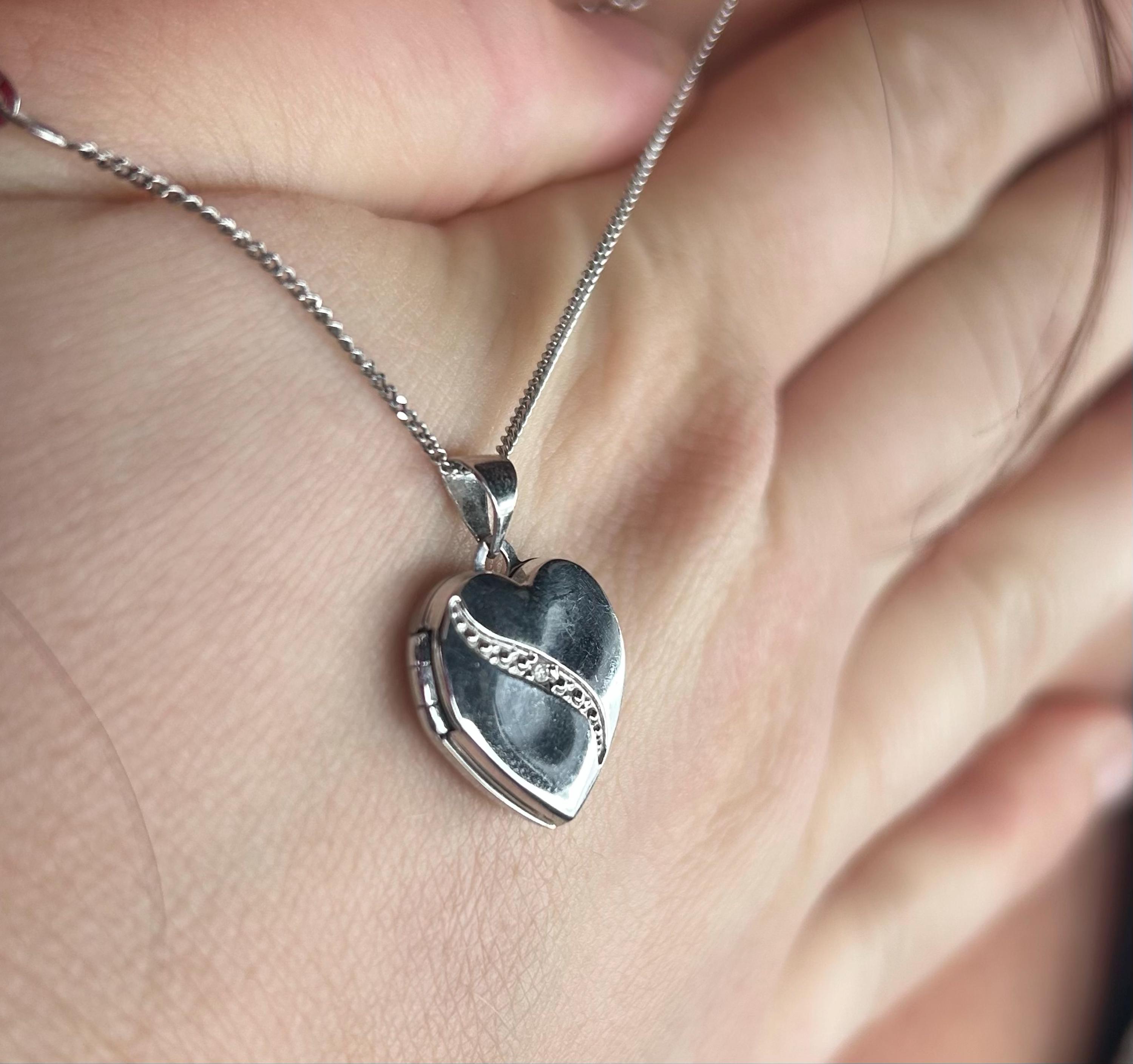 A very pretty 9ct white gold oval shaped hinged locket set with a single real diamond.