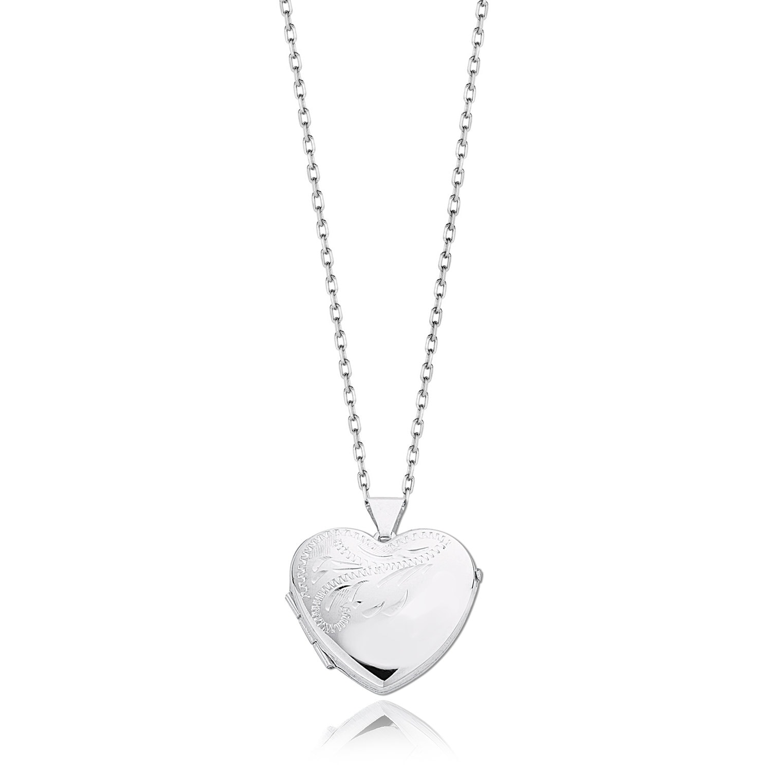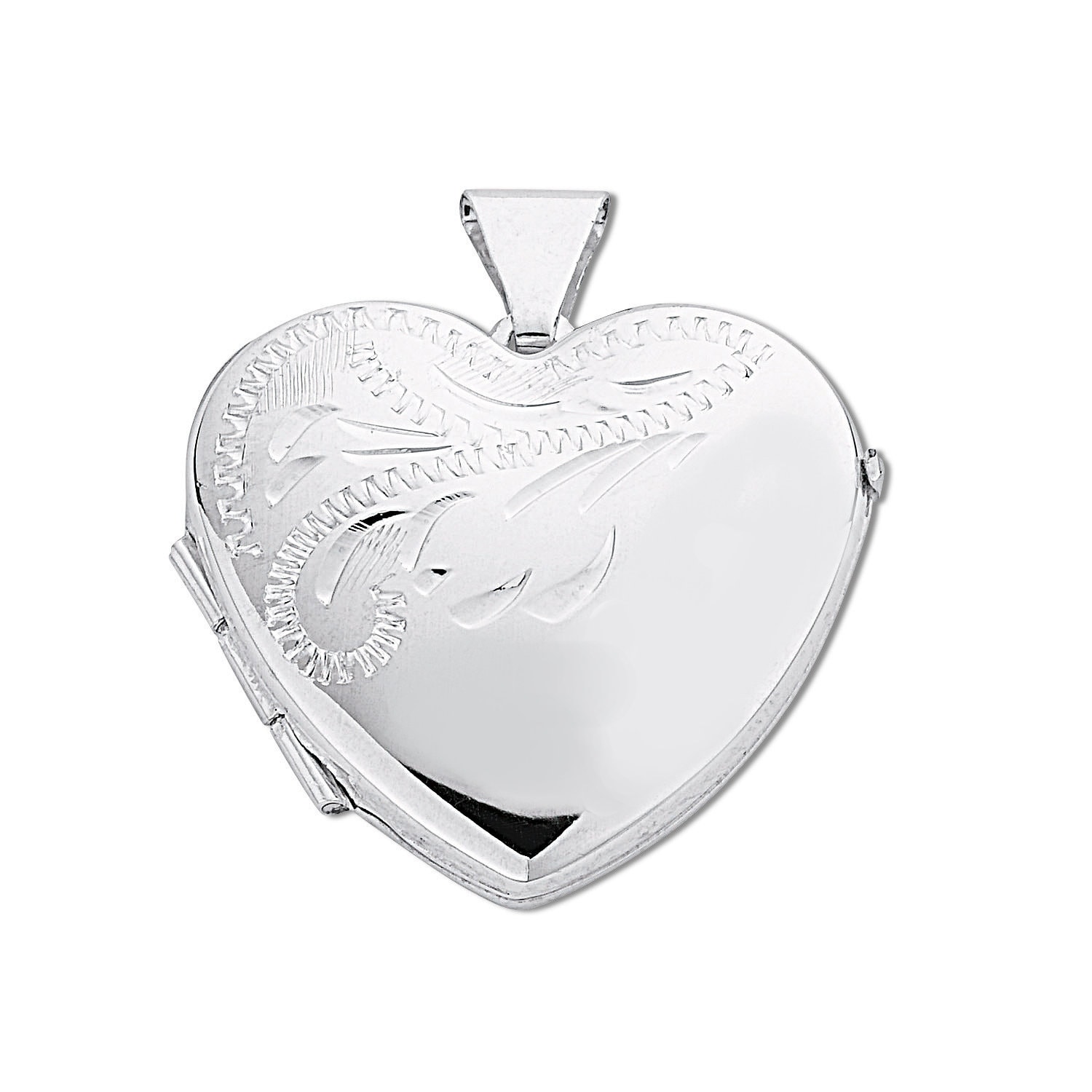 925 sterling silver half engraved pattern heart shaped hinged locket.