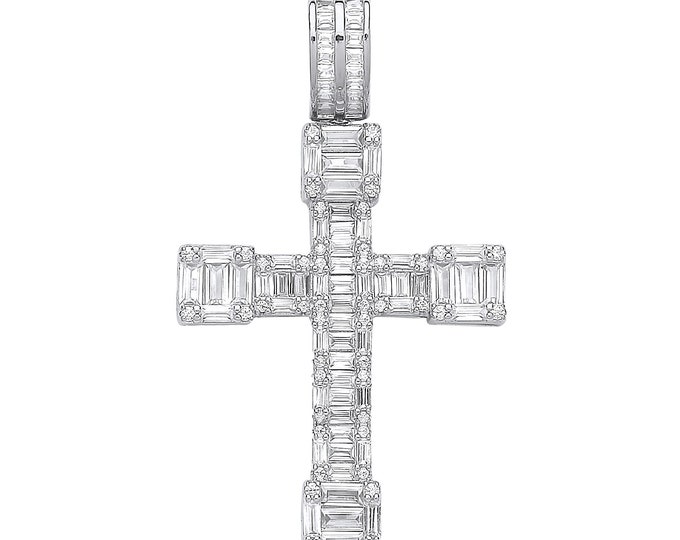 925 Sterling Silver Baguette & Round Cz Fancy Cross Pendant 3.5x2.5cm